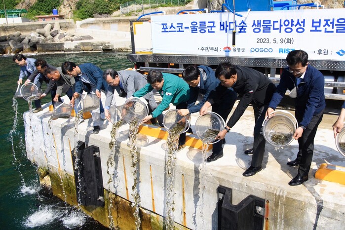 [울릉=백광태 기자] 경북 울릉군과 포스코가 지난 9일 울릉군에서 '2023년 울릉군 남양리 바다숲 조성사업 관리 이관식 행사'로 사업 경과보고회 및 이관식을 진행했다.