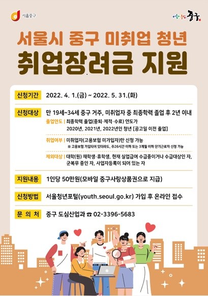 [시민일보 = 여영준 기자] 서울 중구(구청장 서양호)는 지역내 미취업청년들을 격려하고자 취업장려금을 지원한다고 4일 밝혔다.