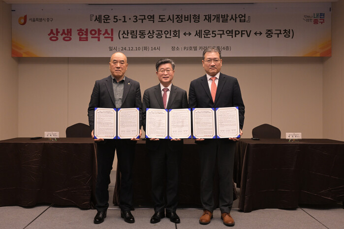 PJ호텔에서 열린 협약식에는 김길성 구청장, 한대식 산림동 상공인회장, 권욱선 세운5구역PFV(주) 대표를 비롯해 구역 내 입주상인 등 100여 명이 참석했다. 삼자는 세입자 모두 합의에 따라 이주를 순조롭게 마칠 수 있도록 협약을 충실히 이행하자는 데 뜻을 모았다.