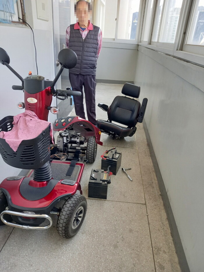 | ▲ 강북구에 거주하고 있는 한 어르신이 전동휠체어를 수리받고 있다. (사진=강북구청 제공) |