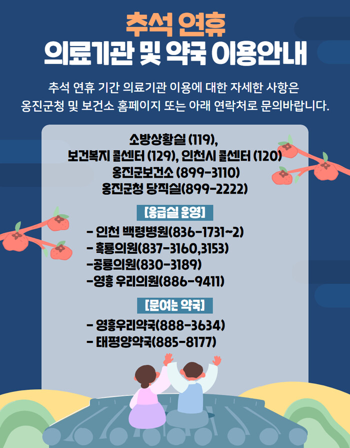 연휴 중 문을 여는 병·의원과 약국 정보는 국번 없이 ▲129(보건복지콜센터) ▲119(구급상황관리센터), ▲응급의료포털 ▲스마트폰 애플리케이션 ‘응급의료정보제공’ 및 ‘응급똑똑’, ▲옹진군청(옹진군보건소) 홈페이지에서 확인할 수 있다.
