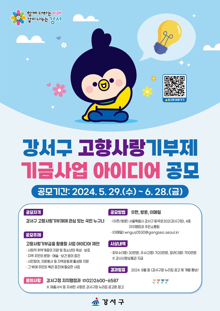 [시민일보 = 변은선 기자] 강서구(구청장 진교훈)가 오는 28일까지 ‘고향사랑 기금사업 아이디어 공모’를 진행한다.
