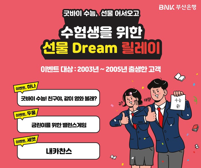 [시민일보 = 여영준 기자] BNK부산은행은 17일, 2023학년도 대학수학능력(이하 ‘수능’) 시험에 응시한 2003~2005년생을 대상으로 ‘수능 끝! 선물 Dream 릴레이’ 이벤트를 시행한다고 밝혔다.