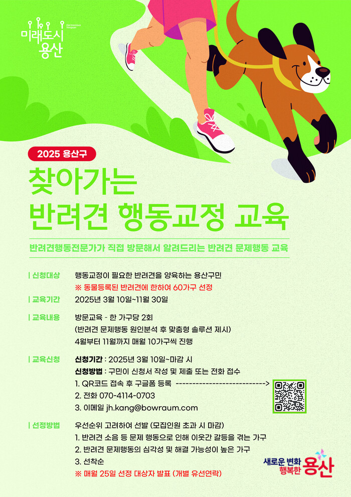 구 관계자는 “이번 ‘찾아가는 반려견 행동 교정 교육’을 통해 반려견으로 인한 이웃 간 불편을 줄이고, 반려동물과 함께하는 행복한 용산을 조성하는 데 기여하겠다”라고 말했다.
