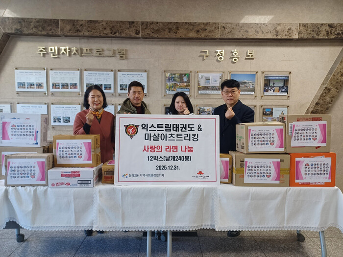 [인천=문찬식 기자] 인천 서구 청라2동에 위치한 청라 익스트림태권도&마샬아츠트릭킹(이하 청라익스트림태권도, 관장 박용복)은 지난 12월31일 청라2동 지역사회보장협의체(공동위원장 김남효, 김기완)에 라면 12상자(240봉)를 기부하며 지역사회 내 훈훈한 감동을 선사했다.