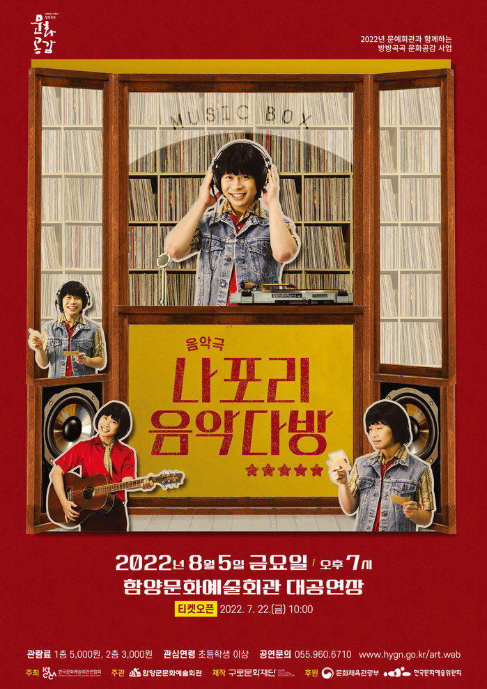 티켓 예매는 오는 22일 10시부터 온라인(인터파크 및 함양문화예술회관 홈페이지, 8월 4일까지) 및 현장결제(문화예술회관 1층, 8월 5일 공연전까지)가 가능하며, 관람료는 1층 5,000원, 2층 3,000원이며 초등학생이상 관람이 가능하다.