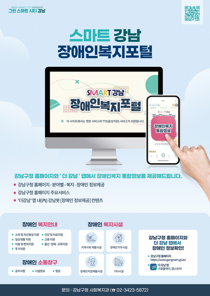 [시민일보 = 이대우 기자] 서울 강남구(구청장 조성명)가 복지 정보 및 시설 접근이 어려운 장애인에게 통합적 복지 정보를 제공하는 ‘스마트 강남, 장애인 복지포털’을 구축, 공식 오픈했다.