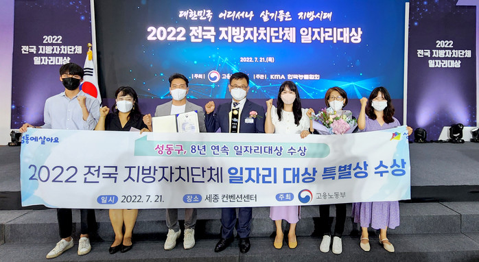 [시민일보 = 홍덕표 기자] 서울 성동구(구청장 정원오)는 최근 ‘2022년 전국 지방자치단체 일자리 대상’에서 서울시 자치구 중 유일하게 8년 연속 수상의 영예를 안으며 일자리 창출 선도 지자체로서의 이름을 알렸다.