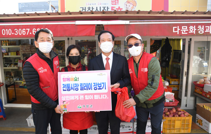 구인모 거창군수는 릴레이를 통해 “단계적 일상회복을 맞아 거창 전통시장을 찾는 군민이 많아져 상인에게는 힘과 용기를, 지역경제는 웃음꽃이 활짝 피어나서 전통시장이 지역경제의 중심이 되길 기대한다”고 말했다.