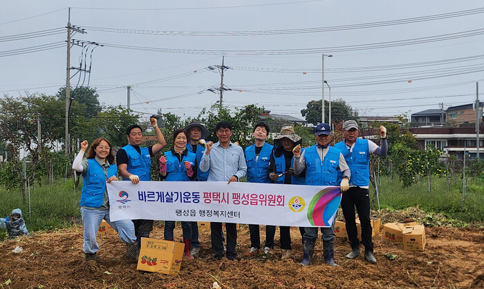 [평택=오왕석 기자] 평택시 바르게살기운동 팽성읍 위원회(위원장 박성숙)는 지난달 30일(화) 팽성읍 남산리 77-14 텃밭에서 ‘이웃사랑 고구마 수확 행사’를 진행했다.