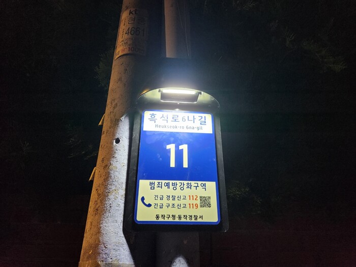 먼저, 구는 전국 최초로 경찰서와 협업해 범죄취약지역을 대상으로 조명형 주소 정보시설 설치를 완료했다. 태양광 LED 보행자 감시 센서 등 기초번호판 17개와 벽 부착식 축광형(야광) 도로명판 26개를 부착했다.
