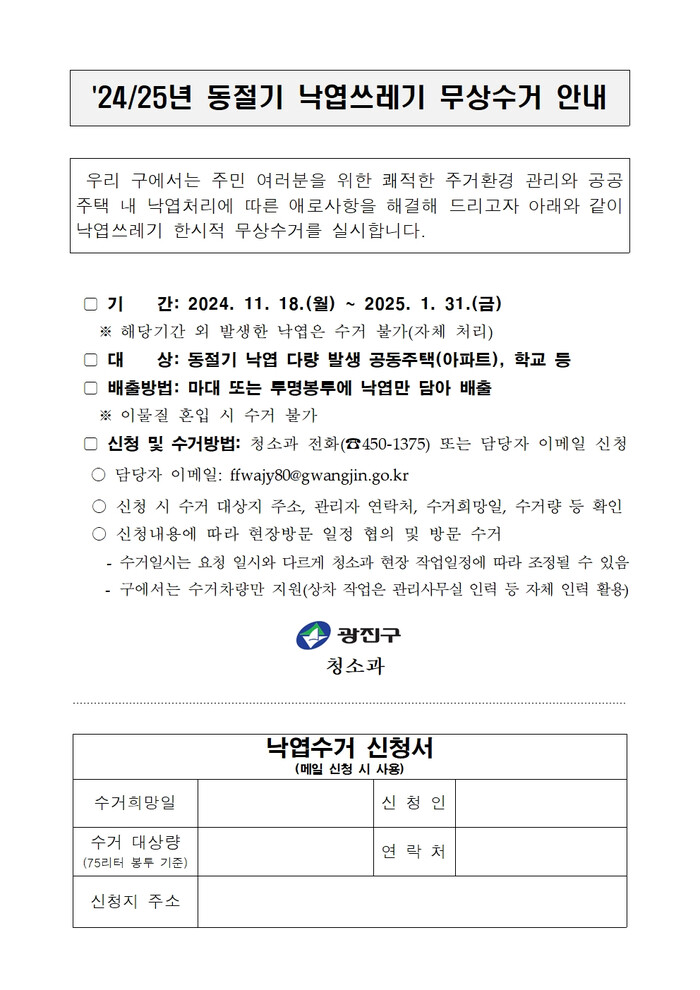 무상수거를 희망하는 구민은 낙엽쓰레기를 마대나 투명 봉투에 담아 광진구청 청소과 또는 담당자 이메일(ffwajy80@gwangjin.go.kr)로 신청하면 된다. 광진구는 방문 일정 협의 후 수거 차량을 보내 낙엽쓰레기를 수거할 예정이다. 단, 생활 쓰레기 등 이물질이 섞여 있을 경우 수거가 불가하므로 낙엽만 담아 배출해야 한다.