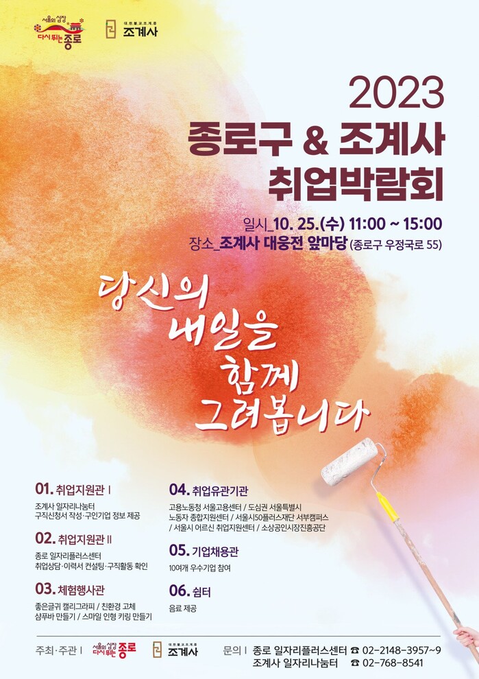 또 취업지원관(종로일자리플러스센터, 조계사 일자리나눔터)과 유관기관(서울고용노동청 서울고용센터, 서울시 어르신 취업지원센터 등), 기업채용관(구인기업 12개 업체) 포함 총 22개 부스가 조성되며, 캘리그라피나 친환경 고체 샴푸바 만들기 같은 각종 체험행사도 연다.