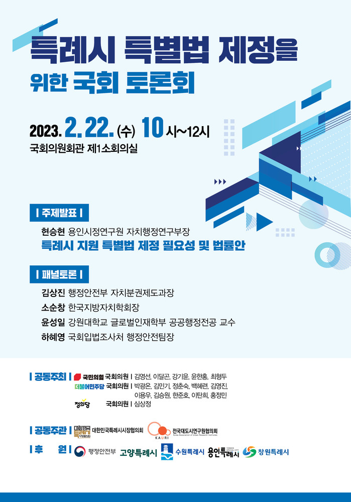 용인특례시(시장 이상일)는 22일 국회 의원회관 제1소회의실에서 '특례시 특별법 제정을 위한 국회 토론회'가 열린다고 21일 밝혔다.