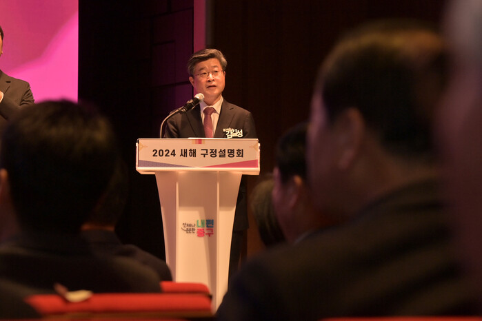 | ▲ 올해 구정설명회에서 김길성 구청장이 신년사를 하고 있다.(사진=중구청 제공) |