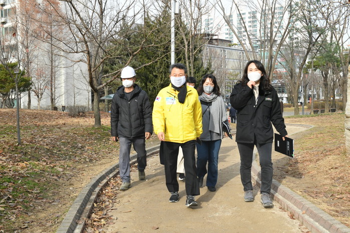 안승남 경기 구리시장은 최근 수택3동 시민과의 대화에서 운동기구 설치 등의 건의사항이 제기된 장자호수공원과 한강시민공원을 직접 찾아 민원 해결 진행상황 및 보행 산책로 등을 점검했다. 사진은 안 시장(왼쪽 두 번째)과 관계자들이 공원 현장점검을 하고 있는 모습. (사진제공=구리시청)