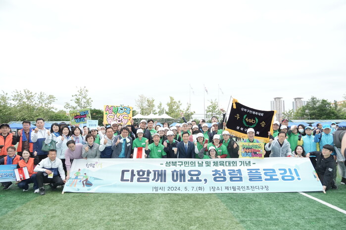 7일 ‘성북구민의 날 기념식 및 구민체육대회’ 폐회 후 진행한 이번 행사는 이승로 성북구청장을 비롯해 구 공직자, 체육대회 참가자, 일반 주민 약 3천여 명이 함께 했다. ‘플로깅’이란 운동을 하면서 쓰레기를 줍는 환경보호 활동으로 참가자들은 경기 종료 후 함께 주변을 정리하고 쓰레기를 주우며 깨끗한 환경과 청렴한 공직 문화의 가치를 돌아봤다.