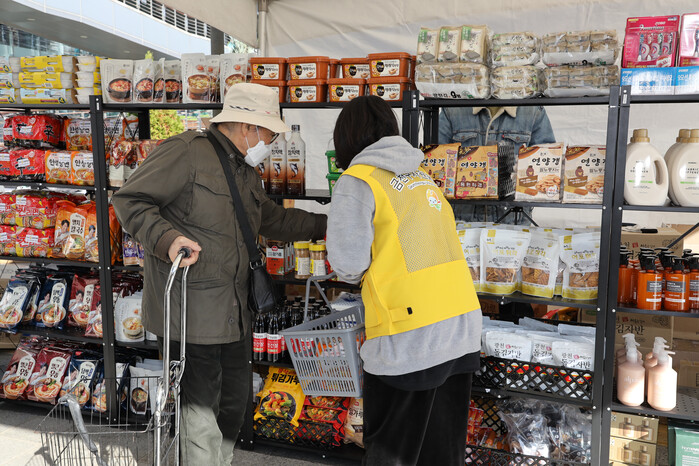 훈훈한 별천지 겨울마켓은 지역내 취약계층 300가구가 필요한 물품을 직접 골라 가져가는 방식으로 운영됐다. 매대에는 겨울을 앞두고 김치, 방한용품, 식료품 선물세트 등이 진열됐다.