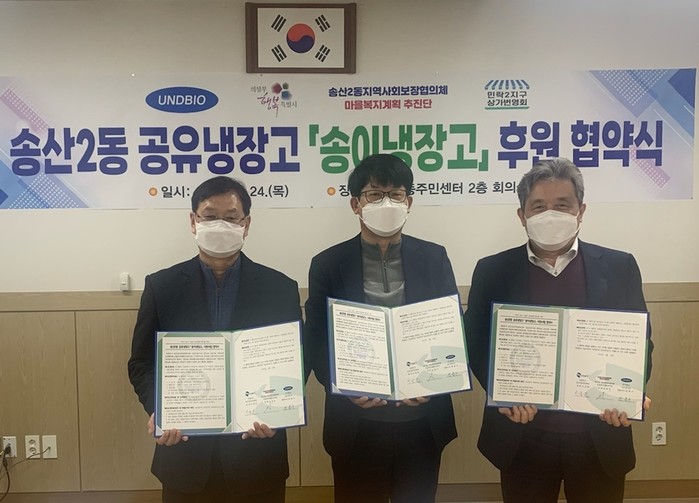경기 의정부시 송산2동은 지역사회보장협의체·마을복지계획추진단·(주)운트바이오·민락2지구 상가번영회와 '송이냉장고(송산2동 공유냉장고) 후원협약'을 체결했다. 이 기관들은 먹거리 공동체를 형성하고 나눔을 통한 공유문화 확산 등 공동 목표를 가지고 사업을 추진하기로 했다. 사진은 협약식에서 관계자들이 기념촬영을 하는 모습. (사진제공=의정부시청)