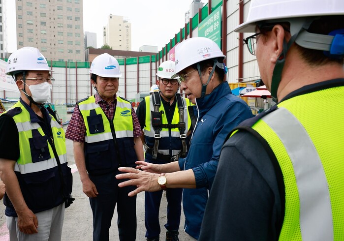 | ▲ 2023년 6월30일 잠실진주아파트 공사 현장을 찾은 서강석 구청장이 문화유산 발굴로 사업 지연이 우려된 주민 및 공사 관계자들로부터 어려움을 듣고 있다. (사진=송파구청 제공) |