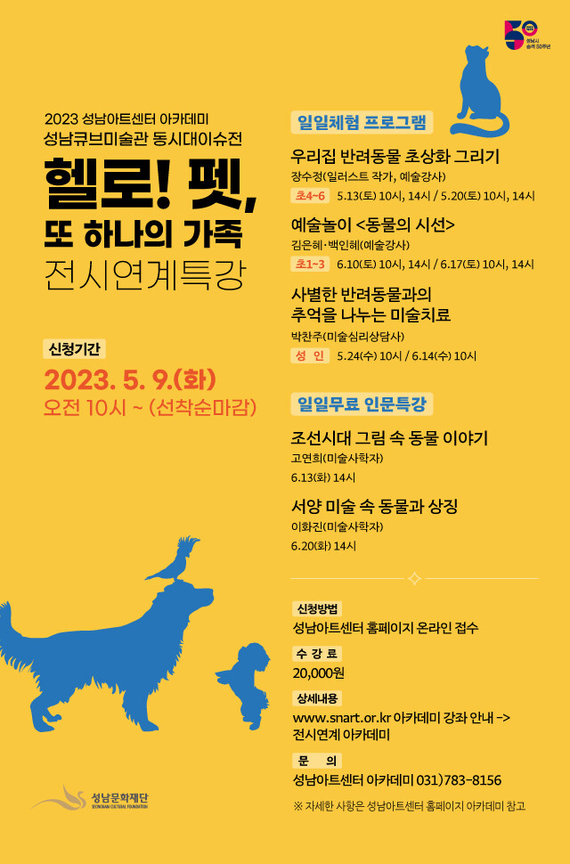 각 강좌 프로그램은 성남아트센터 홈페이지에서 선착순으로 접수하며, 기타 자세한 사항은 전화로 문의하면 된다. 한편 이번 강좌와 연계한 2023 동시대이슈전 <헬로! 펫, 또 하나의 가족>은 성남아트센터 큐브미술관 기획전시실에서 오는 6월 25일(금)까지 이어진다.