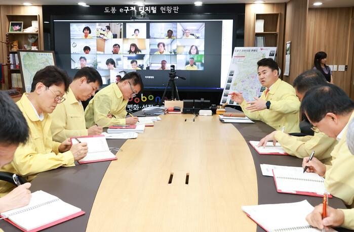 오언석 도봉구청장이 17일 구청장실에서 풍수해 재난안전대책본부 및 14개 동주민센터 동장 화상회의를 주재했다. 오 구청장은 이날 회의에서 지역내 지하차도 4곳에 폭우로 인한 피해가 발생하지 않도록 긴급 점검을 지시하고 산사태 우려 지역, 상습 침수지, 공사장, 빗물받이 등 재해취약지역에 대한 집중 점검을 당부했다. 사진은 오 구청장(오른쪽)이 발언하는 모습. (사진=도봉구청 제공)
