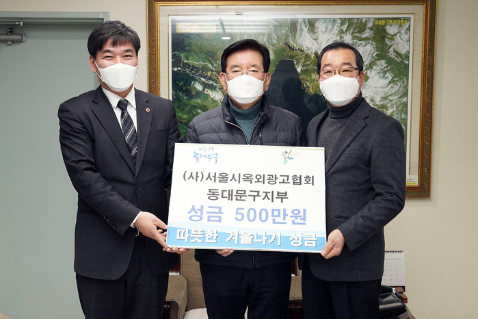 서울 동대문구는 27일 (사)서울시옥외광고협회 동대문구지부로부터 따뜻한 겨울나기 불우이웃돕기 성금 500만원을 기탁받았다. 기탁된 성금은 서울사회복지공동모금회를 통해 취약계층을 위한 생계비·의료비 등으로 사용될 계획이다. 사진은 전달식에서 유덕열 구청장(가운데)과 관계자들이 기념촬영을 하는 모습. (사진제공=동대문구청)