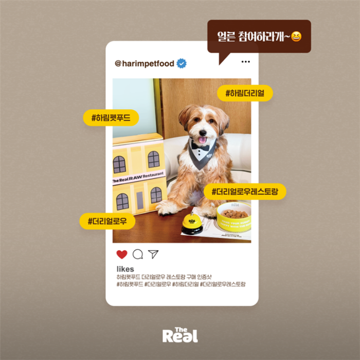이벤트 참여 방법은 반려동물에게 턱시도턱받이를 입히고 테이블매트와 더리얼로우 레스토랑 패키지를 셋팅 한 후, 반려동물이 레스토랑 종을 치면 더리얼로우를 서빙하는 순간을 촬영하여 개인 SNS에 업로드하면 된다.