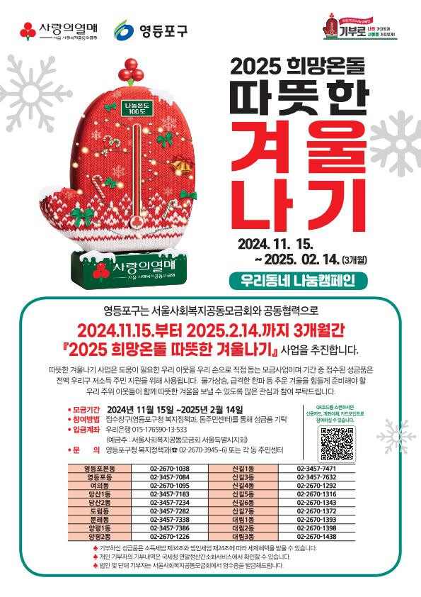 [시민일보 = 여영준 기자] 영등포구(구청장 최호권)가 15일 선포식을 시작으로, 3개월간 ‘2025 희망온돌 따듯한 겨울나기 사업’을 추진해 사회적 약자를 위한 나눔과 기부문화를 확산한다고 밝혔다.