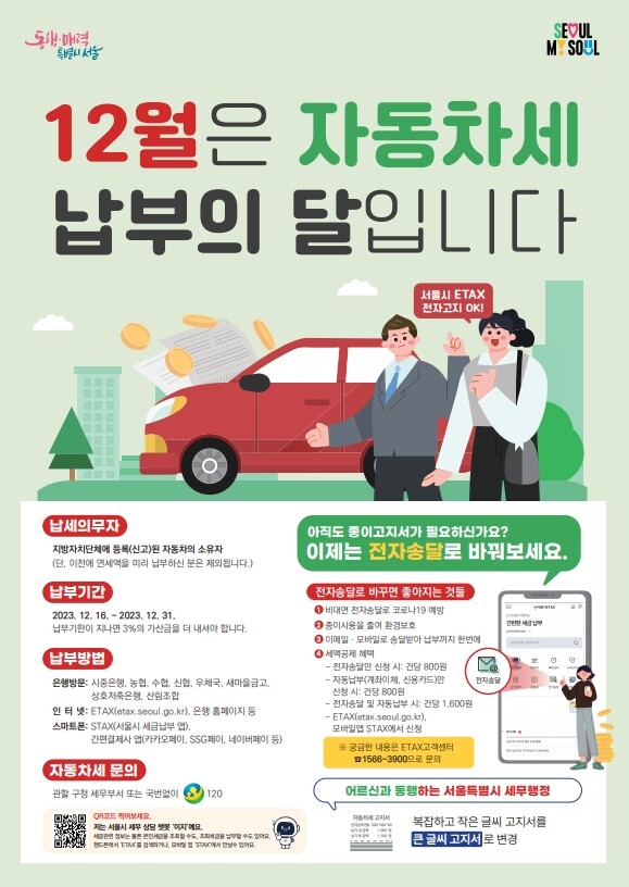 납부는 2024년 1월 2일까지 은행, 인터넷뱅킹, 에이알에스(ARS), 서울시 지방세 인터넷 납부시스템, 스마트폰 서울시 세금납부(STAX) 앱을 통해 할 수 있다.
