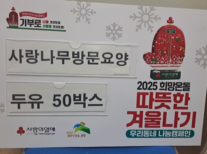 [시민일보 = 이대우 기자] 은평구(구청장 김미경) 불광1동은 지난 18일 사랑나무방문요양센터가 지역 사회에 따뜻한 나눔을 실천하기 위해 두유 50박스를 기부했다고 밝혔다.