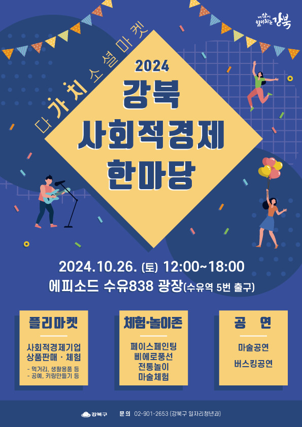 [시민일보 = 문민호 기자] 강북구(구청장 이순희)는 오는 26일 낮 12시부터 오후 6시까지 에피소드 수유838 광장(강북구 도봉로 315, 수유역 5번 출구 인근)에서 「2024 강북구 사회적경제 한마당 – 다‘가치’ 소셜 마켓」을 개최한다고 밝혔다.