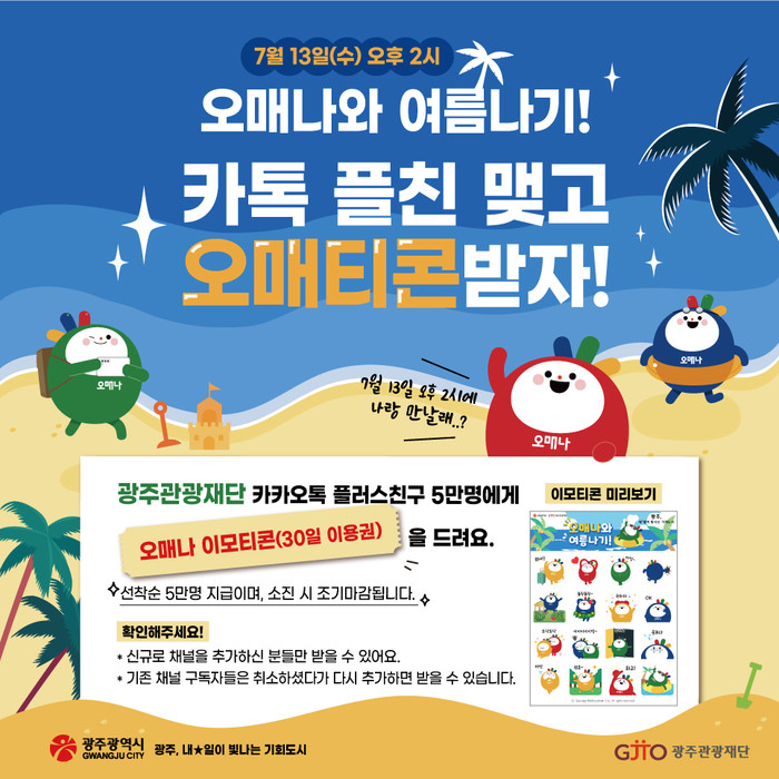 이번 행사는 휴가철을 맞아 광주관광재단이 진행하는 ‘광주, 여름여행’ 이벤트의 일환으로, 오는 13일 오후 2시부터 ‘오매나와 여름나기’ 모션 이모티콘 16종을 전국민 대상 선착순 5만 명에게 무료 배포한다.