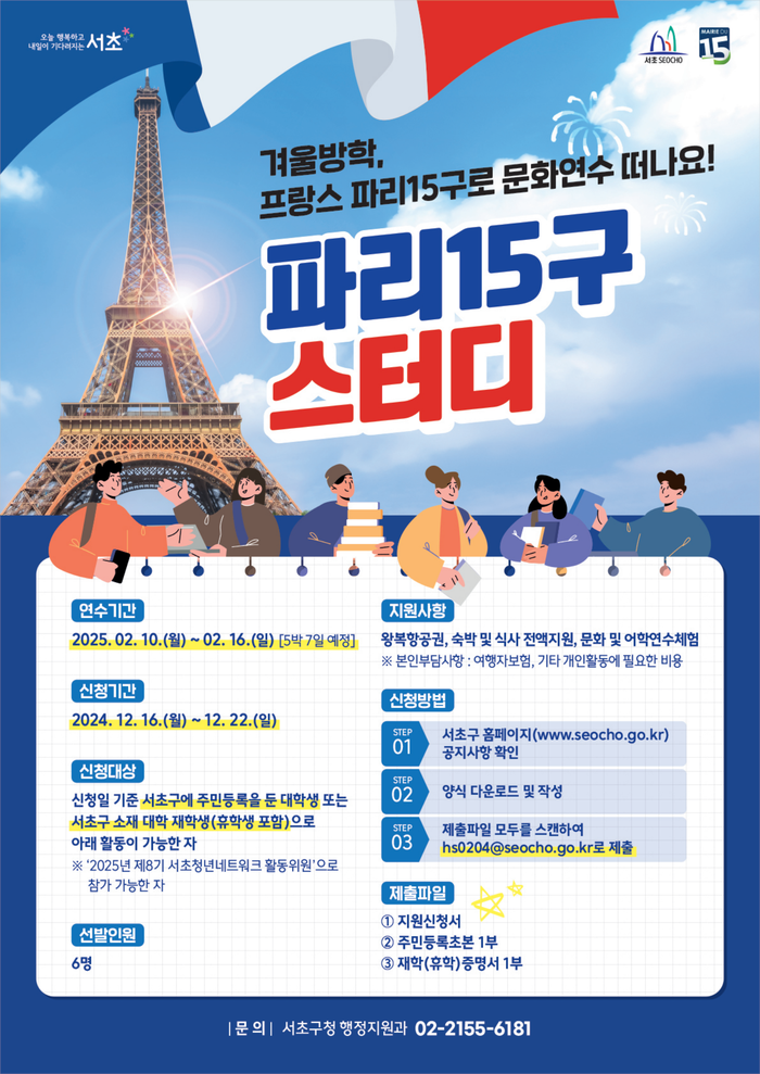 모집 대상은 서초구에 주민등록을 둔 대학생 또는 서초구 소재 대학에 다니는 학생으로, 지원 서류를 작성해 담당자 이메일(hs0204@seocho.go.kr)로 제출하면 된다. 경비는 파리15구에서 전액 지원한다.