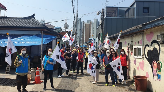 경기 동두천시 생연2동 행정복지센터는 최근 제67회 현충일을 맞이해 12통 태극기 마을 정비를 실시해 낡고 오래된 태극기를 교체했다. 생연2동 12통 태극기 마을은 2015년 6월부터 나라사랑 태극기달기 운동 시범마을로 선정돼 태극기를 365일 게양하고 있다. 사진은 이날 참여한 봉사자들이 기념촬영을 하고 있는 모습. (사진제공=동두천시청)