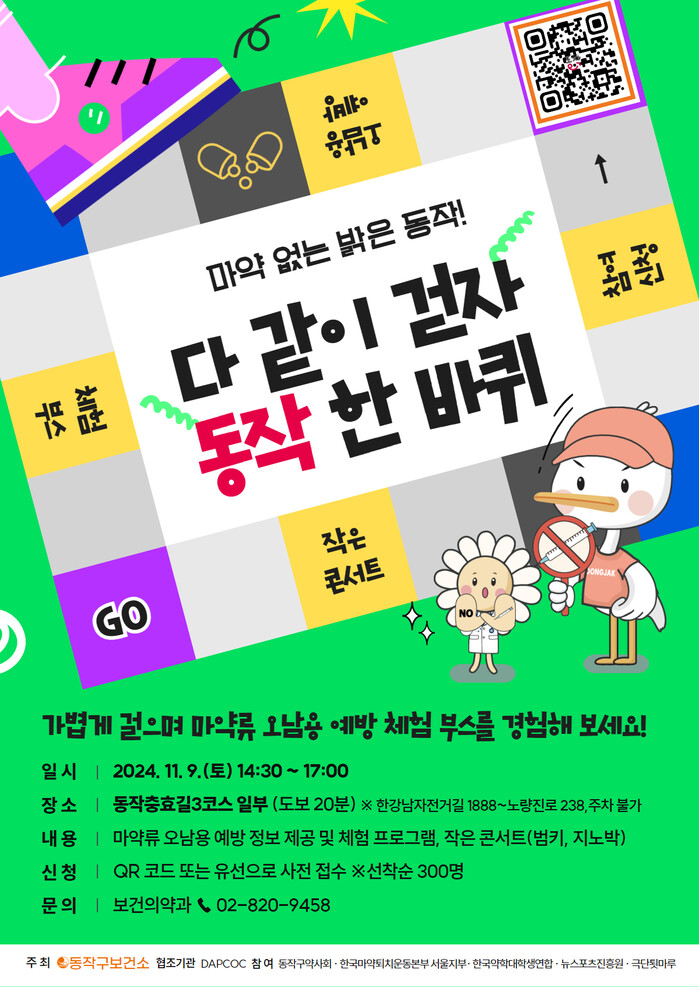 구는 지역사회 모두가 청소년 마약류 오남용에 관심을 가질 수 있도록 ▲대학을 위한 마약 및 중독예방센터 ▲동작구약사회 ▲한국약학대학생연합 ▲한국마약퇴치운동본부 서울지부 ▲뉴스포츠진흥원 등의 참여를 유도한 가운데, 청소년 및 동반 가족을 모집 중이다.