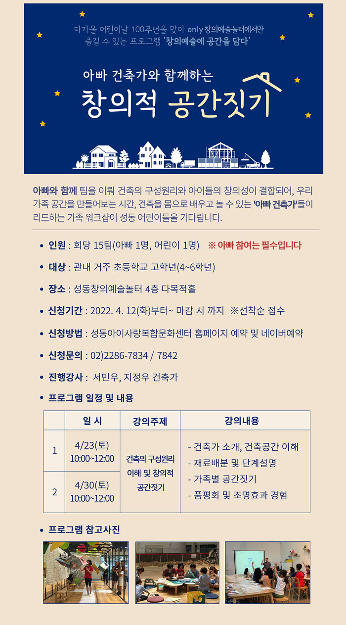 이번 프로그램은 4월 23·30일 오전 10시 ‘창의적 건축공간 짓기’라는 내용으로 2회(30팀)에 걸쳐 진행된다.