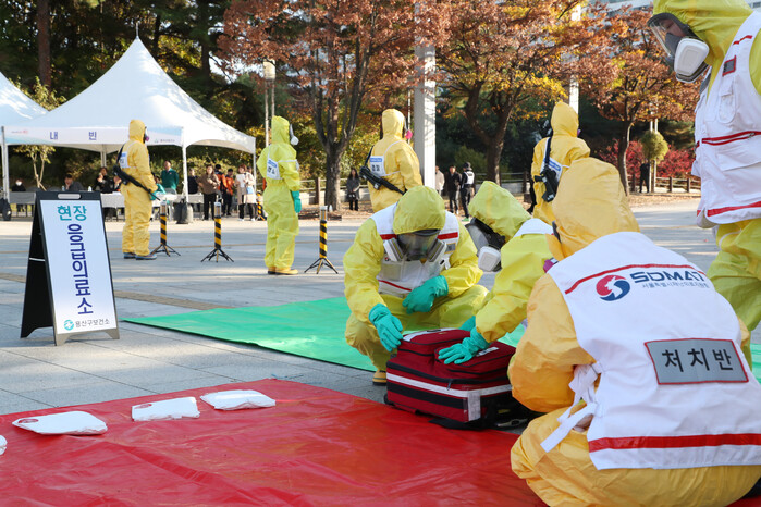이번 훈련은 다중이용시설에 탄저균이 살포되는 상황을 가정하고 시민 신고와 감염병 확산을 조기에 차단하는 내용으로, ▲상황 발생 및 전파 ▲탐지키트 검사 및 검체 수집 ▲화생방 정찰 ▲탐지키트 양성 판정 이후 제독 ▲노출자 구조 ▲현장 응급의료소 운영 및 환자 이송 순으로 훈련을 진행했다.