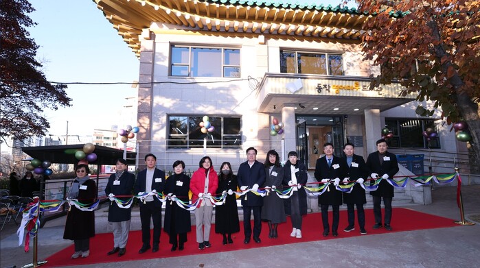 | ▲ 박일하 구청장(왼쪽 일곱 번째)이 지난 11월30일 서울 동작구 노량진동에 문을 연 동작영어마루도서관 개관식에 참석해 테이프 커팅식을 하고 있다. (사진=동작구청 제공) |