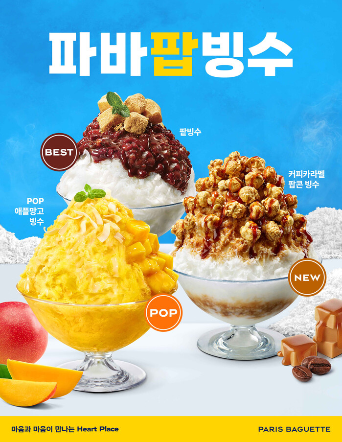 ‘파바팝빙수'의 팝(POP)은 '팝'콘 빙수, 'POP(인기있는)' 애플망고 빙수, '팥'빙수 등 3종을 유쾌한 언어유희로 아우르는 의미다. 팝콘을 비롯한 과일, 팥 등 다양한 토핑을 활용해 색다른 맛과 즐거움을 느낄 수 있다.