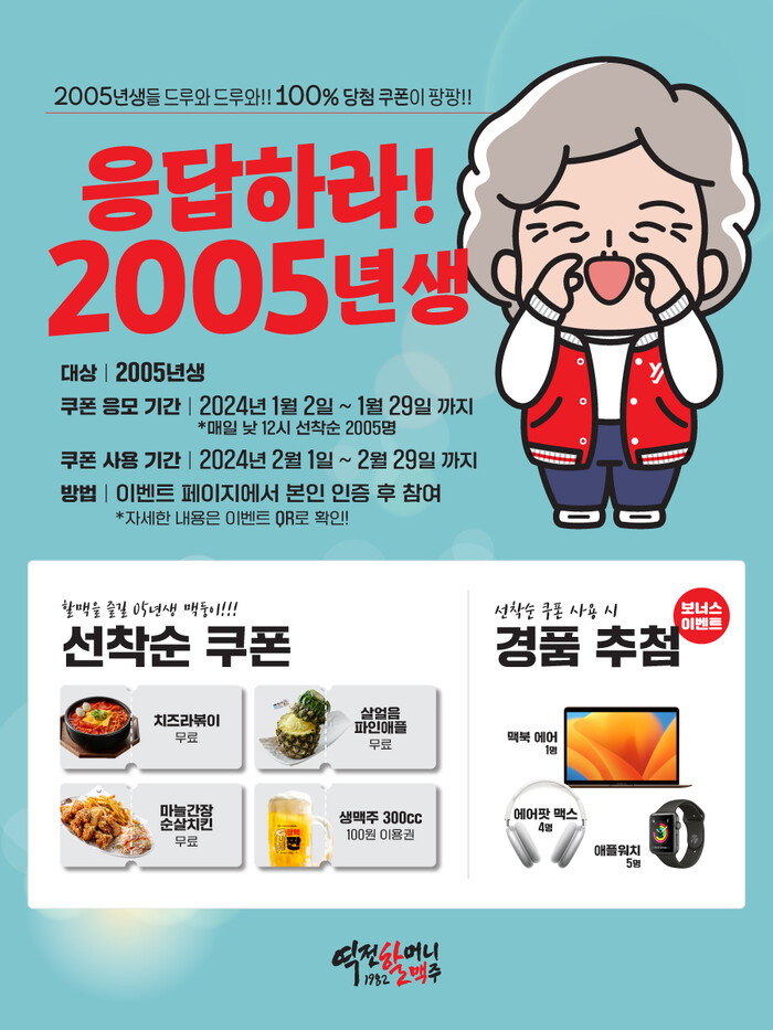 살얼음 생맥주 대표 브랜드 역전할머니맥주가 2024년 청룡의 해를 맞아 새롭게 성년이 되는 2005년생을 대상으로 ‘응답하라! 2005년생’ 프로모션을 실시한다고 밝혔다.