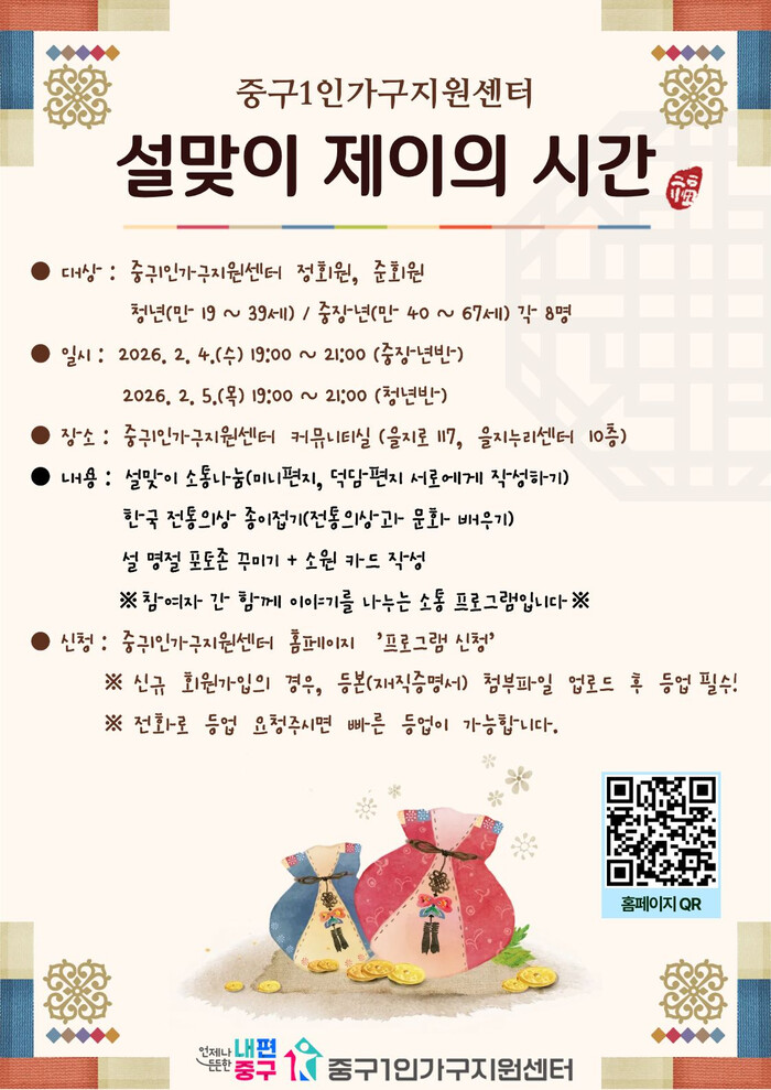 [시민일보 = 여영준 기자] 중구는 설 명절을 앞두고 4~14일 중구1인가구지원센터(이하 ‘센터’)에서 ‘설맞이 특별 프로그램’을 운영한다고 밝혔다.