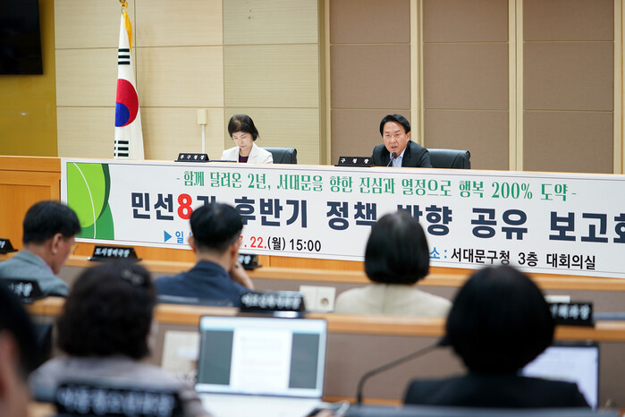 [시민일보 = 이대우 기자] 서대문구(구청장 이성헌)가 최근 구청 3층 대회의실에서 지난 2년간의 성과를 바탕으로 민선 8기 후반기 주요 과제를 논의하는 정책 방향 공유 보고회를 개최했다.