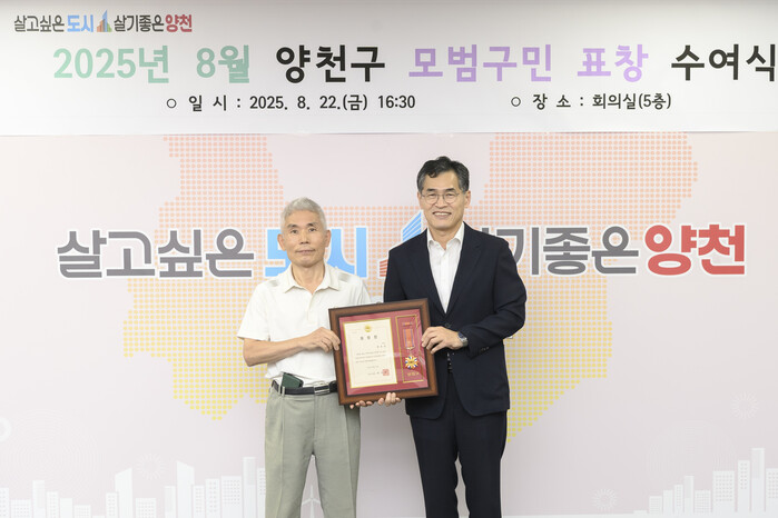 양천구가 최근 구청 회의실 5층에서 ‘2025년 8월 양천구 모범구민 표창 수여식’을 개최했다. 선정된 모범구민은 총 9명이다. 사진은 수여식에서 이기재 구청장(오른쪽)이 모범구민에게 표창을 수여한 후 기념 촬영을 하는 모습. (사진=양천구청 제공)