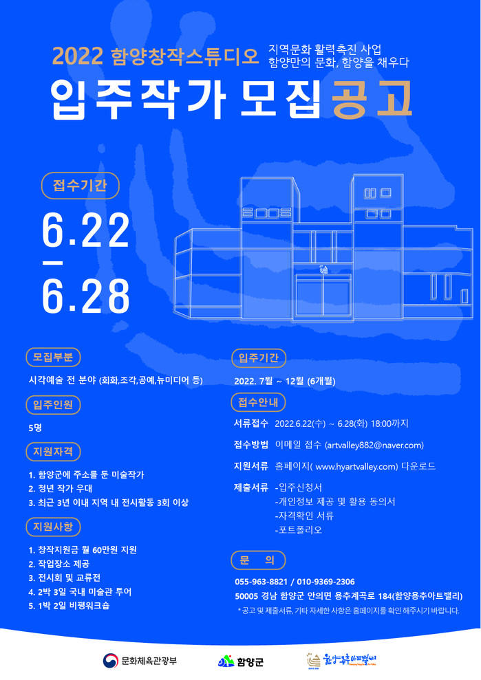 함양용추아트밸리(이사장 박유미)에서 함양창작스튜디오 운영을 위해 입주작가를 오는 28까지 공개 모집한다.