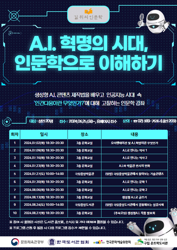 ‘인공지능(A.I.) 혁명의 시대, 인문학으로 이해하기’는 문화체육관광부가 주최하고 한국도서관협회와 한국문화예술위원회가 공동 주관하는 ‘2024년 길 위의 인문학’ 공모사업이다.