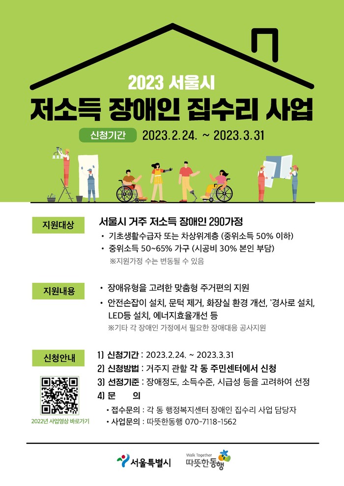 오는 31일까지 주소지 동주민센터를 방문해 신청할 수 있으며, 사업에 선정되면 장애 유형을 고려한 맞춤형 주거환경 개선으로 화장실 개조, 문턱 제거, 경사로 및 핸드레일, 화재감지기 등의 편의시설 설치와 에너지효율 시공 등을 지원받게 된다.