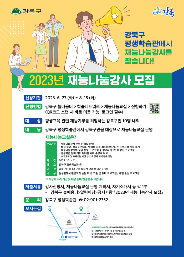 [시민일보 = 홍덕표 기자] 서울 강북구(구청장 이순희) 평생학습관이 27일부터 2023년 재능나눔강사를 모집한다.