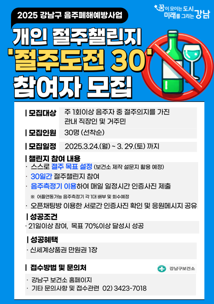 [시민일보 = 이대우 기자] 강남구(구청장 조성명)가 오는 24일부터 ‘절주도전 30’에 참여할 관내 직장인 및 주민 30명을 선착순 모집한다.