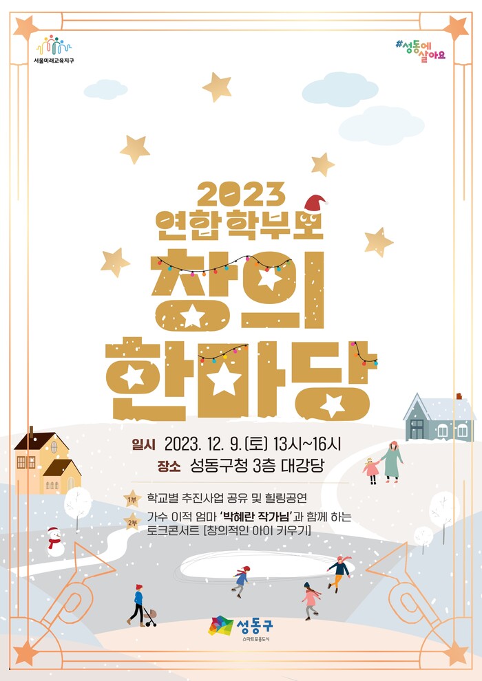 [시민일보 = 홍덕표 기자] 서울 성동구(구청장 정원오)는 오는 9일 오후 1시부터 구청 3층 대강당에서 '2023 연합 학부모 창의한마당'을 개최한다.